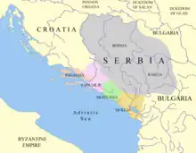 Dans son De Administrando Imperio, Constantin VII indique que le territoire serbe était majoritairement gouverné par la dynastie des Vlastimirović qui parvint sous Časlav Klonimirović à unifier les terres en une confédération au début du Xe siècle. La première référence historique quant à l'existence d'un État des Serbes date du IXe siècle et est le fait de l'empereur byzantin Léon VI le Sage qui, dans ses listes épiscopales, mentionna les « évêques de Drougoubiteia et des Serbes ». En 993, des ambassadeurs serbes arrivèrent à la cour de l'empereur Basile II.