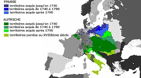 La France établit également des colonies en Amérique du Nord, dans les Caraïbes et en Inde, comme le firent également l'Espagne et le Portugal, rivalisant avec la Grande-Bretagne. Une série de guerres contre cette dernière lui fit pourtant perdre la majeure partie de ces territoires au XVIIIe siècle, appelés aujourd'hui par certains historiens le Premier espace colonial français par opposition au Second espace colonial français qu'elle conserva par la suite, notamment en Afrique et en Asie du Sud-Est.