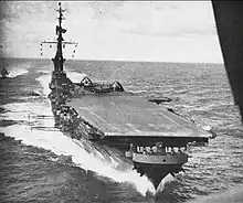En 1934, pour remplacer le HMS Argus, la Royal Navy décida la construction d'un porte-avions de 22 000 tonnes, c'est-à-dire un peu plus lourd que les porte-avions alors en construction aux États-Unis et au Japon, pour embarquer un groupe aérien de 72 appareils avec 20 % de chasseurs. Ce surcroît de poids résultait du choix d'un hangar « fermé », c'est-à-dire intégré dans la coque et non pas construit en superstructure. Cela entraînait que les parois latérales étaient protégées par la ceinture blindée de 4,5 pouces (114 mm) et un pont blindé de 3,5 pouces (89 mm) à hauteur de plancher du hangar, au-dessus des chaudières et de la machinerie du gouvernail, et de 2,5 pouces (63,5 mm) au-dessus des turbines[50]. Le pont d'envol, en acier et non en lattes de bois de teck, comme sur la classe Yorktown, ne portait cependant pas de blindage. Deux catapultes hydropneumatiques ont été installées à l'avant, pour pouvoir catapulter des appareils, pendant que d'autres apponteraient, mais cela conduisait à une longueur du pont d'envol de l'ordre de 240 m, alors que pour des raisons de maniabilité, la coque n'a pas mesuré plus de 210 m. Il en a résulté un porte-à-faux arrière du pont par rapport à la coque de 24 m, ce qui aura été une caractéristique de la silhouette de ce porte-avions[51]. Un soin particulier a été porté à l'aérodynamisme de l'îlot et de la cheminée, dotée d'un profil d'aile d'avion, pour réduire les turbulences sur le pont d'envol[52].