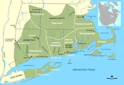 Deux guerres indiennes majeures éclatent en 1637 et 1675. Après des combats avec les Hollandais, les Britanniques l'emportent à la fin des années 1630 et triomphent également d'une sanglante guerre contre les Amérindiens, connue comme la guerre des Pequots, démarrée en 1637 par une attaque de ces derniers. Les pourparlers avec les Amérindiens ayant échoué, les colons du Connecticut placent 90 hommes sous les ordres du capitaine John Mason. Plus tard, un pasteur de l'église de Hartford exhorte ces soldats à une tuerie. Rejoints par un grand nombre d'Amérindiens ennemis des Pequots, parmi lesquels les Mohegans du chef Uncas et les Narragansetts du chef Miantonomoh, ils progressent en direction du village fortifié de Missituck (Mystic) qui abrite des guerriers pequots et leur famille. Rejoints par les hommes du capitaine John Underhill, du Massachusetts, les colons et leurs alliés cernent le village le . En moins d'une heure le village est brûlé, les survivants presque tous tués, femmes et enfants inclus. Des historiens comme Alfred Cave pensent aujourd'hui qu'il y a eu 600 ou 700 victimes, en plus d'une centaine parmi les guerriers pequots venus des environs de Missituck, pour tenter de venger ses habitants. Au sud, d'autres colons plus puritains ont fondé la colonie de New Haven en 1637. Les deux colonies étaient séparées de la colonie de la baie du Massachusetts, principalement parce que les puritains de Massachusetts ont regardé ces nouvelles colonies comme soupape de sûreté pour les personnes non-conformistes. La colonie de Saybrook est fusionnée dans la colonie du Connecticut en 1644 et la colonie de New Haven suit le même chemin en 1662.