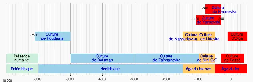 Le peuplement du Primorié a commencé il y a plus de 30 000 ans[1], lorsque des tribus venues d'autres régions d'Asie comme la Mandchourie se sont installées près des côtes. Ces premiers habitants étaient des chasseurs de mammouths et des cueilleurs, avec un mode de vie nomade, et ils chassaient en groupe. Leur stratégie de chasse consistait à pousser l'animal jusqu'à une falaise, le faire tomber puis l'achever avant de prendre la viande. La plus ancienne implantation humaine connue a été retrouvée près du village d'Ossinovka (raïon de Mikhaïlovka), peuplée possiblement il y a 40 000 à 35 000 ans AP. Ossinovka est considéré par l'archéologue soviétique Alekseï Okladnikov comme le premier complexe du paléolithique supérieur au Primorié[2]. Cependant, il est supposé que les rives de la Suifen furent peuplées bien avant, mais aucune trace ne le prouve[fegi 1],[fegi 2]. Les études archéologiques ont prouvé de profondes similitudes entre les sites archéologiques du Primorié et ceux des Îles Kouriles, de Sakhaline et de la partie nord-est de l'île d'Hokkaidō[3].