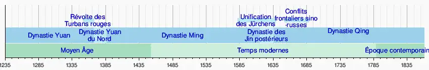 Entre 1404 et 1434, la dynastie Ming cherche à étendre son influence. En 1409, elle crée la commission militaire régionale de Nurgan, chargée de la Mandchouie. Elle cherche à propager le bouddhisme tandis que les chefs de tribus Jürchens ont été nommés membres de la commission pour s'assurer de leurs loyautés.Même si une commission existait, la région était assez indépendante, le pouvoir n'ayant aucun intérêt à imposer un pouvoir fort[83]. En 1491, la forteresse de Ts Zaoshan[note 10] fut attaquée par la tribu Jürchen « Nimache », capturant hommes et bétails. Ils furent pourchassés par des troupes chinoises, et le chef de la tribu fut tué quelques jours plus tard[83].