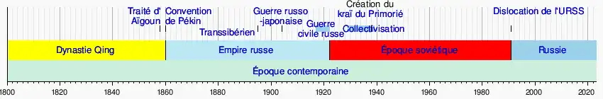 Au cours de la seconde moitié du XIXe siècle, les Européens, dont les Britanniques et les Français, commencent à s’intéresser à l'Extrême-Orient et en particulier à la Chine. L'empire Qing, en position de faiblesse, se voit dans l'obligation d'accepter de nombreux traités inégaux, et l'Empire russe y prend sa part. C'est ainsi qu'en 1858 puis en 1860, les Russes signent avec la Chine, respectivement, le traité d'Aïgoun et la convention de Pékin, qui permettent l'annexion de la Mandchourie-Extérieure puis du Primorié. Lors de la guerre civile russe, le territoire devient un bastion des Armées blanches et il est contrôlé par les Japonais dans le cadre de l'intervention alliée en Sibérie. L'éphémère gouvernement provisoire de Priamour constitue le dernier bastion blanc de cette guerre. En , il est envahi par l'Armée rouge, avec la prise de Vladivostok le 25. En parallèle, les troupes blanches et alliées fuient vers la Corée japonaise et l'archipel nippon.