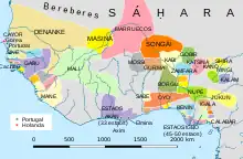 En 1444 Dinis Dias passe au large de l’embouchure du fleuve Sénégal pour atteindre le point le plus occidental du continent africain, qu'il nomme Cabo Verde, le Cap-Vert[51], en raison de la luxuriante végétation qu'il y observe. Il atteint également l'île de Gorée que ses habitants désignent sous le nom de Berzeguiche et qu’il baptise Ilha de Palma, l’île des Palmes. Les Portugais ne s’y installent pas de manière permanente, mais utilisent le site pour y faire escale et pratiquer le commerce dans la région[52]. Ils y construisent néanmoins une chapelle en 1481[53]. Des comptoirs portugais sont également installés à Tanguegueth[54] dans le Cayor, une localité qu’ils renomment Rio Fresco (le futur Rufisque) à cause de la fraîcheur de ses sources, dans le Baol à Sali (la future station balnéaire de Saly) qui prend le nom de Portudal, ou encore à Joal dans le royaume du Sine.