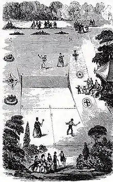 L'avocat et mémoiriste William Hickey rappelle qu'en 1767 « en été, nous avions un autre club, qui se réunissait à la Red House à Battersea Fields, presque en face de Ranelagh... Le jeu auquel nous jouions était une invention de notre cru, et s'appelait le tennis sur gazon, qui offrait un noble exercice... Le champ, qui s'étendait sur seize acres, était tenu dans un ordre aussi élevé et lisse qu'un terrain de boules"[26].
