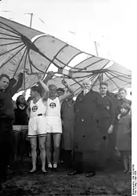 | 3 mai 1927 | 14 h 07 min. | 455,8 km distance aller-retour | Monde (FAI) | L'Allemand Ferdinand Schulz sur le Westpreußen, au Küstenflugwettbewerb de Rossitten (de)[67]. Le même jour il produit un record de vitesse sur circuit fermé sans atterrissage supérieure à 1 km: 10 km à 54,45 km/h[68], et un record de durée à 14 h 07 min[69]. | |