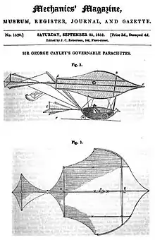 George Cayley (1773 à 1857) décrit les problèmes de vol aérodynamique de manière fondamentale et est donc également appelé le « père de l'aéronautique ». Il rompt avec le vol avec battement d'aile et publie en 1809-1810 une proposition de machine volante avec une surface inclinée et un mécanisme de propulsion. Il est le premier à décrire le principe des avions modernes à voilure fixe. En septembre 1852, il publie dans Mechanics’ Magazine (de) les plans et descriptions d'un planeur monoplan qui avait été testé avec succès avec lest: lorsqu'il le lance du sommet d'une colline sans pilote, il navigue avec un équilibre parfait vers la plaine en contrebas, et lorsqu'une personne court avec lui contre le vent, il le porte parfois sur quelques mètres. Cayley avait probablement les connaissances et la capacité de construire et d'utiliser un planeur transportant un homme, mais il avait malheureusement en tête la nécessité d'un moteur et a donc raté l'occasion de devenir le père du vol sans moteur[1].