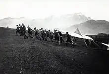 Kurt Rothenberger (à gauche) et Helmut Berg (à droite) avec leur hängegleiter «Chögli» fait maison selon les plans de Hermann Aecherli- Les étudiants de l'école cantonale de Trogen (de) en Suisse, en février 1928, construisent leur premier planeur un RRG-Zöglings qui a fait ses preuves dans la Rhön, et baptisent le premier planeur « Kauz » (Le « Marabu » a suivi plus tard). Elisabeth Pletscher, qui était élève à l'école cantonale en 1928, a commenté les enregistrements du film 75 ans plus tard.