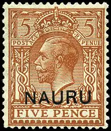 Lorsque Nauru passe sous contrôle du Royaume-Uni en 1916, des timbres de ce pays sont surchargés « NAURU »[1],[5]. Ces timbres surchargés restent en circulation jusqu'à ce qu'une série spécifique est fabriquée en Australie en 1924 avec pour légende « NAURU »[1],[5],[6].