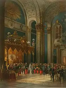 Au cours du XVIIIe siècle, Pierre le Grand (1672-1725), au prix d'une longue guerre avec la Suède, obtient un accès à la mer Baltique ; il fait construire Saint-Pétersbourg, fondée en 1703[29], qui devient la nouvelle capitale en 1712, symbolisant ainsi l'ouverture du pays vers l'Europe. Une puissante industrie métallurgique, la première d'Occident à l'époque, est édifiée dans l'Oural et permet de soutenir l'effort de guerre. Le , Pierre prend le titre d'« Empereur de toutes les Russies », qui remplaça le traditionnel titre de tsar qui lui était jusque-là accordé. Catherine II de Russie (1762-1796[30]), autocrate éclairée[31], achève la conquête des steppes situées au bord de la mer Noire après avoir défait l'Empire ottoman et le khanat de Crimée et repousse vers l'ouest les frontières de l'empire russe grâce au partage de la Pologne. La Petite Russie (Ukraine) et la Russie blanche (Biélorussie) sont désormais entièrement en territoire russe.
