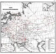 Enfin, l'empire s'étend aussi vers l'Extrême-orient. En 1855, le traité de Shimoda établit les frontières des deux pays, l'île de Sakhaline faisant l'objet d'un échange lors du traité de Saint-Pétersbourg de 1875. La Convention de Pékin de 1860[44], qui met un terme à la seconde guerre de l'opium avec la Chine, offre à la Russie un accès à la mer du Japon. Le Transsibérien est prolongé jusqu'à Vladivostok, fondée en 1860[45], permettant l'acheminement des troupes tsaristes. Cependant, la mainmise de la Russie sur la Mandchourie et ses prétentions sur la Corée entrainent une rivalité avec le Japon alors lancé dans la phase de modernisation accélérée du Meiji, débouchant sur la guerre russo-japonaise de 1904-1905 qui elle marque une victoire d'un peuple non-blanc sur un pays occidental.