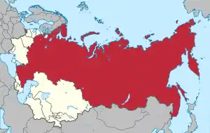 Dans le même temps, le culte de la personnalité est porté à son comble par Staline. Peu après le décès de celui-ci en 1953, Nikita Khrouchtchev accède au pouvoir et dénonce les excès de son prédécesseur. Sur le plan intérieur commence une période de relative prospérité[réf. nécessaire] ; les droits des citoyens sont mieux respectés, c'est le début d'une certaine libéralisation. L'URSS stupéfie le monde par son avance dans le domaine spatial en mettant en orbite le premier Spoutnik et en y envoyant Youri Gagarine, premier homme dans l’espace. Sur le plan international, l’URSS élargit son influence à de nombreux pays du tiers-monde et parvient par des investissements massifs dans l’armement à faire jeu égal avec les États-Unis, notamment dans le domaine nucléaire et des missiles balistiques. Cette période de guerre froide se traduit par de nombreux conflits ou tensions un peu partout dans le monde entre les deux superpuissances et leurs alliés. La crise de Cuba en 1962 manque de dégénérer en un conflit nucléaire. L’accession de Léonid Brejnev au pouvoir (1964) se traduit par une relative détente entre les deux grands grâce à la Conférence sur la sécurité et la coopération en Europe (CSCE) mais également, sur le plan intérieur, par une réduction des tentatives de réforme qui n’avaient pas réussi à son prédécesseur (Programme des terres vierges entre autres). L’écart entre le niveau de vie des Soviétiques et celui des habitants des pays occidentaux s’accroît. La tension entre les deux superpuissances reprend à compter de 1979 à la suite de l’invasion de l’Afghanistan et de l’arrivée de Ronald Reagan à la présidence des États-Unis en 1980.
