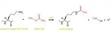 Les queues N-terminales des protéines histones liées à l'ADN et formant le nucléosome peuvent subir des modifications post-traductionelles. L'histone acétyltransférase (HAT) va, comme son nom l’indique, transférer un groupement acétyle sur certains résidus lysines des queues N-terminales. L'enzyme HAT catalyse la création d'un groupe amide non chargé par l'addition d'un groupement acétyle (provenant de l'acétyle Coenzyme A) sur le groupement ammonium de la lysine (figure 1).