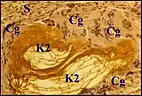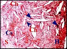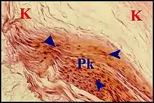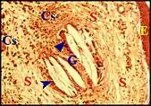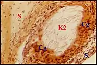 Le stroma en revanche ne dérive pas du derme mais est fourni par la lamina propria sensu lato de l’oreille moyenne, couche fibreuse tympanique comprise. En effet, il ne renferme pas d’annexes cutanées, présentes seulement dans un cas exceptionnel d'hétérotopie mixte (choristome). De plus, les deux types d’épithéliums, épidermique et de caisse, sont souvent visibles de part et d’autre du même stroma conjonctif, disposition déjà notée par d’autres auteurs mais presque sans commentaire[5],[1],[15]). La mise en évidence de leurs cytokératines permet de les accentuer. Elle montre alors que le cholestéatome s'est développé à partir d'une poche de rétraction qui présente au début la même structure histologique.
