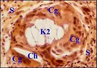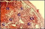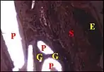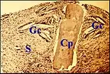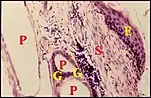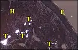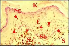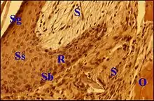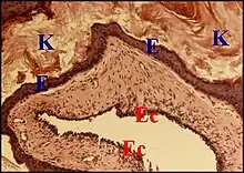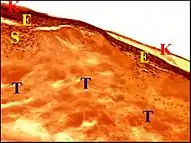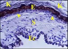 Cet épithélium, auquel d'autres auteurs réservent le nom de « matrix »[5], est formé comme par 4 strates ou couches caractéristiques comme dans un épiderme normal : le stratum basale (couche germinative, basal layer) reposant sur une lame basale ; le stratum spinosum (couche des cellules à épines, prickle cell layer ) ; le stratum granulosum (couche granuleuse, granular layer) ; le stratum corneum (couche cornée, horny layer).