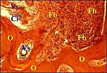 Le tissu conjonctif remplissant les espaces est souvent lâche, d'aspect œdémateux, constitué par une substance fondamentale très claire, par des fibres collagènes, et par des fibroblastes, ces derniers plus ou moins groupés autour des vaisseaux sanguins ou près de l'os, l'ensemble constituant une fibrose plus ou moins dense. Ces cellules sont marquées par leur vimentine mais peuvent aussi exprimer l'actine musculaire lisse, indice d'une possible différenciation en myofibroblastes comme dans les greffes veineuses lors de la chirurgie de l'otospongiose [7]). Fait remarquable, elles sont susceptibles de proliférer densément comme Harris[12]) l'a observé dans du matériel osseux temporal et des osselets. Dans 5 des cas observés, la prolifération était même si active qu'un véritable tissu fibromateux agressif en faisceaux détruisait l'os sur une grande étendue.
