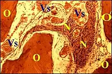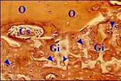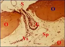 Dans les osselets normaux, les espaces périvasculaires, en continuité avec le stroma de la muqueuse, et les cavités médullaires centrales, non élargis sont seulement occupés par un tissu conjonctif peu abondant avec quelques adipocytes. L'os périosté et endochondral adjacent montre des systèmes haversiens bien formés et non modifiés.