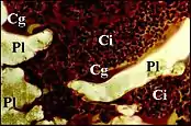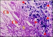 L'invasion ossiculaire par des tissus extraosseux (étrangers) provenant de l'oreille moyenne est facilitée non seulement par l'ostéolyse mais aussi, et surtout, par la continuité existant entre le stroma de la caisse ou du cholestéatome et les espaces péri-vasculaires. Il n'a pas été observé d'épithélium malpighien cholestéatomateux inclus.