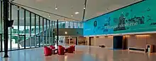 - Le béton : matériau résistant et massif, le béton assure une forte densité du bâtiment aussi bien au niveau technique que visuel. Il est utilisé en contrepoids de la légèreté du verre et de l’acier.