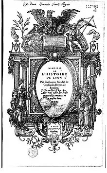Toutefois, ces passionnés de traces antiques ne se lancent pas dans un véritable travail historique vis-à-vis de leur ville. Le premier érudit à publier une histoire de Lyon est Guillaume Paradin en 1573[1]. Il commence par reprendre les travaux de plusieurs prédecesseurs sur les inscriptions antiques de la ville mais il y ajoute une description chronologique des évènements survenus à Lyon, s'arrêtant en 1559, avec les fêtes en l'honneur de la Paix de Cateau-Cambrésis[d 2].
