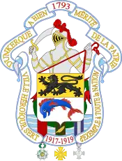 Le , le Président de la République Vincent Auriol, remettait la Croix de guerre 1939-1945 avec palmes en récompense des sacrifices lors de la Bataille de Dunkerque en mai/juin 1940. Après une réactualisation au début des années 1990, la Ville de Dunkerque utilise maintenant comme blasonnement : Coupé : au premier d'or au lion léopardé de sable armé et lampassé de gueules, au second d'argent au dauphin couché d'azur crété, barbé, loré, pautré et oreillé de gueules.[8] |
