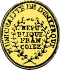 Pendant le Premier Empire, un cachet municipal fut alors adopté, rond de 35 millimètres de diamètre, et portant, dans le champ, un aigle couronné aux ailes déployées, avec les mots en légende : Mairie de Dunkerque, 1er arrondis : (Nord)."[1] Bien qu'ayant 24 175 habitants en 1806, ce qu'il lui permettait d'être une ville de seconde classe dans l'Héraldique napoléonienne, on ne retrouve aucune trace de ces armoiries. |
