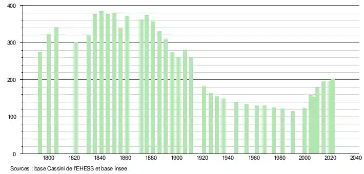 L'évolution du nombre d'habitants est connue à travers les recensements de la population effectués dans la commune depuis 1793. Pour les communes de moins de 10 000 habitants, une enquête de recensement portant sur toute la population est réalisée tous les cinq ans, les populations légales des années intermédiaires étant quant à elles estimées par interpolation ou extrapolation[17]. Pour la commune, le premier recensement exhaustif entrant dans le cadre du nouveau dispositif a été réalisé en 2004[18].