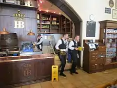 Ce haut lieu de culture populaire allemande traditionnelle, et de tourisme international, sert toute la journée en continu de la cuisine bavaroise, choucroute, saucisse allemande, Bretzel..., et des Maß / chopes de bière traditionnelles d'un litre (Hofbräu München, Helles...), dans une ambiance festive conviviale de taverne traditionnelle (jusqu'à 5 000 convives les soirs de grande affluence, jusqu'à 35 000 cumulés par jour, et quatre millions de personnes par an). Les convives portent parfois les habits bavarois traditionnels lederhose et dirndl. La tradition veut que l'on trinque, de table en table, pour se souhaiter « santé », dans une ambiance d'orchestre de musique traditionnelle bavaroise.