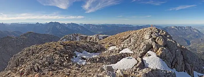 Vue panoramique depuis lesommet du Hoher Göll. La minuscule pointe qui dépasse de l'horizon à gauche est le Schönfeldspitze, puis, dans un creux, le Sommerstein (Steinernes Meer), puis, encore plus lointain s'il est possible, le Grossvenediger (3 657 m), alors que tout en bas dans la brume on aperçoit le Hohes Brett, surplombé par le Grosser Hundstod, puis le Birnhorn, tandis que l'arrondi marqué de deux « dents » est le Watzmann, la deuxième arête étant le Hochkalter, puis dans une trouée des chaînons se dresse le Kaisergebirge, se dresse au milieu, mais restant sous l'horizon, le Reiter Alm avec tout en bas la commune de Ramsau bei Berchtesgaden, puis la façade du Reiter Alm, continuant le Ramsau bei Berchtesgaden, puis le Karkopf et juste après la marque somitale rayée de rouge est le Hochstaufen.