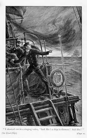 « À environ trois milles de distance, au centre de cette lueur, qui s'étendait à environ quinze degrés au-dessus de l'horizon, était un grand vaisseau qui semblait lutter contre un ouragan violent, quoiqu'il fît un calme plat. Il plongeait et s'élevait sur une eau parfaitement tranquille : tantôt disparaissant sous les flots, tantôt se remontrant à la surface. Sa grand'voile et ses huniers étaient serrés, et il ne portait que sa misaine dont les ris étaient pris, une voile d'étais et une voile de senau sur son arrière. Ce bâtiment semblait poussé par la force du vent vers le Ter Schilling. À chaque instant on le distinguait mieux. Enfin on le vit virer de bord ; et pendant cette manœuvre il était à si peu de distance qu'on aurait pu compter les hommes sur le pont. Mais à ce moment une obscurité soudaine l'enveloppa, et on ne le revit plus[12]. »