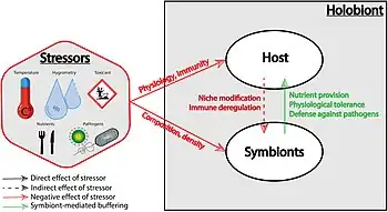 Les facteurs de stress peuvent directement influer sur la physiologie et l'immunité de l'hôte, ainsi que sur la composition et la densité de sa communauté symbiotique. Un stress sur les symbiotes, par exemple induit par des biocides ou pesticides, peut aussi affecter négativement l'hôte.