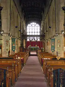 Les fonts baptismaux, somptueusement sculptés et arborant les armes de la maison de Bromfield, datent du début des années 1490. Il y a dans l'aile au sud du chancel une piscine sculptée rapportée d'une autre église. Une plaque commémorative dans l'aile du chancel nord est datée de 1666[4]. L'orgue à double-clavier est un instrument Norman & Beard de 1910 rapporté et réassemblé en 1976 d'une église du Nord de l'Angleterre[5]. Le carillon à six cloches a été coulé au XVIIIe siècle par les Rudhall de Gloucester[6]. L'église porte les stigmates de combats de la Première Révolution anglaise : la façade ouest est percluse de balles de mousquet, tandis que le parement nord est défiguré par trois impacts[7],[8]. Une tablette de bronze comporte un acrostiche où l'on retrouve le nom de : « Thomas Crue[8]. »