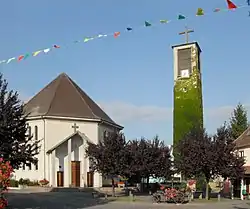 Initialement construite en 1662, l'église pui rénovée en 1765 et agrandie en 1890. Elle est détruite lors de combats de . Le projet de reconstruction de l'édifice est engagé par Eugène Ritzenthaler et son équipe. La première pierre de l'église est bénie par l'évêque de Strasbourg en 1953 et les travaux se terminent en 1956. L’église actuelle fut construite selon les plans de l’architecte Jean du Cailar, originaire de Colmar. Les plans se sont basés sur ceux de l’église d’Ottmarsheim. L'église est particulièrement originale : celle-ci est en effet octogonale et le clocher est un bâtiment isolé, à quelques mètres de l'église[12]. Cette architecture est unique en France.