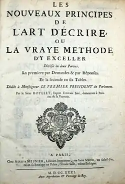- Les Nouveaux principes de l'art d'écrire, ou la Vraye méthode d'y exceller... par le sieur Royllet... Paris : A. Mesnier, 1731. 2°, IV-36-20 p., pl. gravées par Bailleul l'aîné. (Paris BNF, Paris BHVP, Cambridge (MA) HUL, Chicago NL). Dédié à M. Portail, premier Président au Parlement de Paris. Becker 1997 no 149.