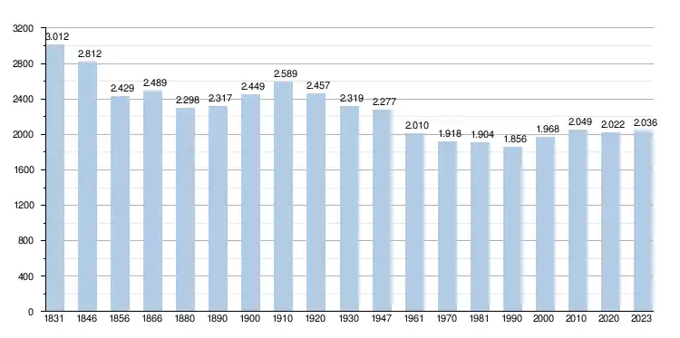 Elle comptait, au , 2 028 habitants (976 hommes et 1 052 femmes), soit une densité de 181,07 habitants/km²[3] pour une superficie de 11,20 km². Graphe de l'évolution de la population de la commune. Les données ci-après intègrent les anciennes communes dans les données avant la fusion en 1977.