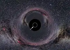Selon la relativité générale, un trou noir en rotation entraînerait autour de lui l'espace-temps dans le même sens par effet Lense-Thirring. La région affectée s'appelle l'ergosphère.