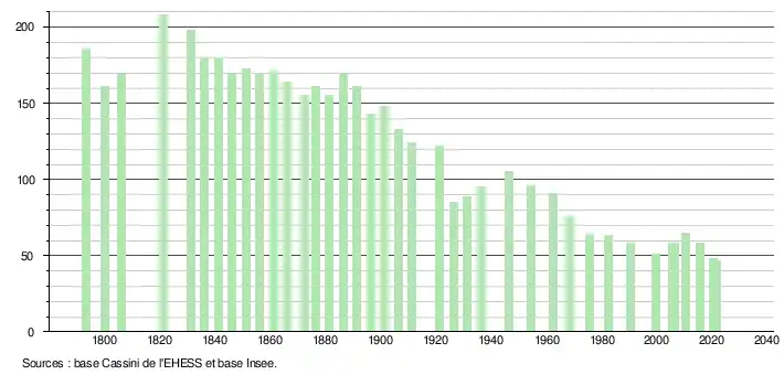 L'évolution du nombre d'habitants est connue à travers les recensements de la population effectués dans la commune depuis 1793. Pour les communes de moins de 10 000 habitants, une enquête de recensement portant sur toute la population est réalisée tous les cinq ans, les populations légales des années intermédiaires étant quant à elles estimées par interpolation ou extrapolation[16]. Pour la commune, le premier recensement exhaustif entrant dans le cadre du nouveau dispositif a été réalisé en 2005[17].