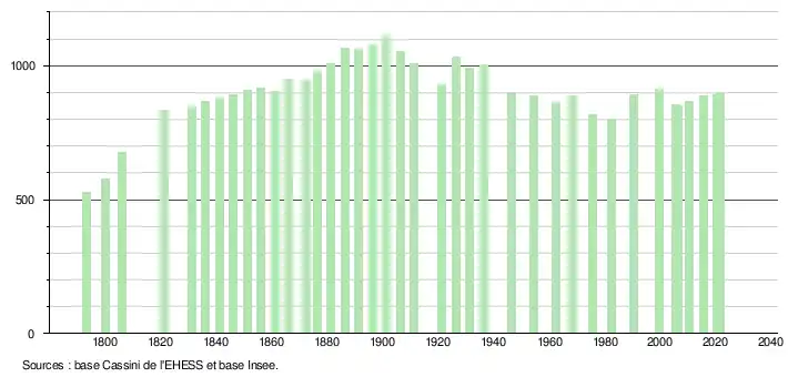 L'évolution du nombre d'habitants est connue à travers les recensements de la population effectués dans la commune depuis 1793. Pour les communes de moins de 10 000 habitants, une enquête de recensement portant sur toute la population est réalisée tous les cinq ans, les populations légales des années intermédiaires étant quant à elles estimées par interpolation ou extrapolation[20]. Pour la commune, le premier recensement exhaustif entrant dans le cadre du nouveau dispositif a été réalisé en 2005[21].