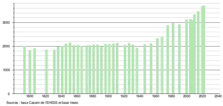 L'évolution du nombre d'habitants est connue à travers les recensements de la population effectués dans la commune depuis 1793. Pour les communes de moins de 10 000 habitants, une enquête de recensement portant sur toute la population est réalisée tous les cinq ans, les populations légales des années intermédiaires étant quant à elles estimées par interpolation ou extrapolation[35]. Pour la commune, le premier recensement exhaustif entrant dans le cadre du nouveau dispositif a été réalisé en 2004[36].