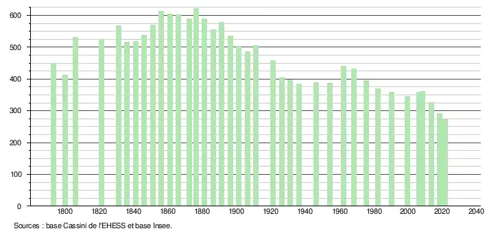 L'évolution du nombre d'habitants est connue à travers les recensements de la population effectués dans la commune depuis 1793. Pour les communes de moins de 10 000 habitants, une enquête de recensement portant sur toute la population est réalisée tous les cinq ans, les populations légales des années intermédiaires étant quant à elles estimées par interpolation ou extrapolation[17]. Pour la commune, le premier recensement exhaustif entrant dans le cadre du nouveau dispositif a été réalisé en 2008[18].