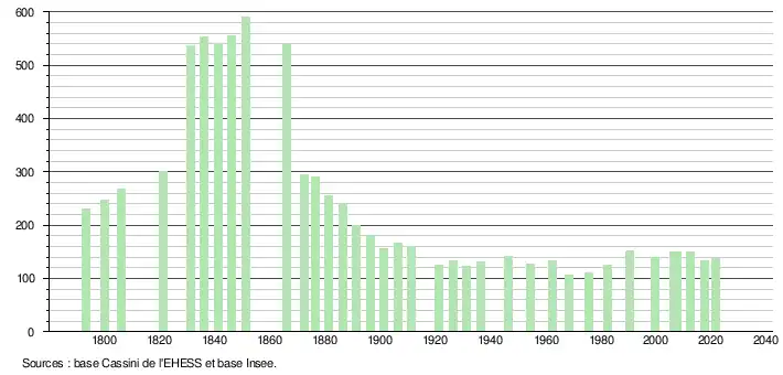 L'évolution du nombre d'habitants est connue à travers les recensements de la population effectués dans la commune depuis 1793. Pour les communes de moins de 10 000 habitants, une enquête de recensement portant sur toute la population est réalisée tous les cinq ans, les populations légales des années intermédiaires étant quant à elles estimées par interpolation ou extrapolation[18]. Pour la commune, le premier recensement exhaustif entrant dans le cadre du nouveau dispositif a été réalisé en 2007[19].