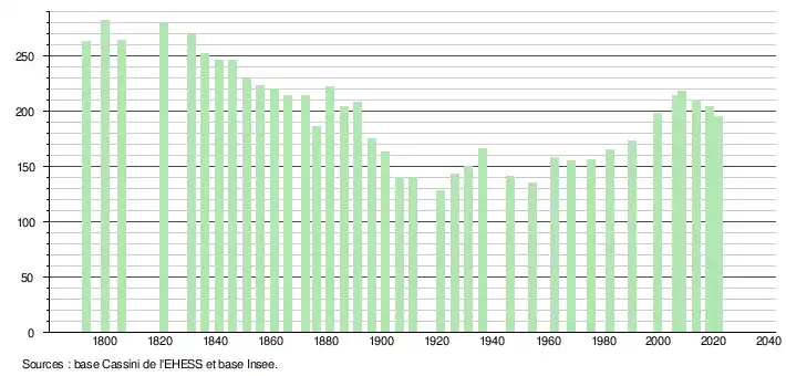 L'évolution du nombre d'habitants est connue à travers les recensements de la population effectués dans la commune depuis 1793. Pour les communes de moins de 10 000 habitants, une enquête de recensement portant sur toute la population est réalisée tous les cinq ans, les populations légales des années intermédiaires étant quant à elles estimées par interpolation ou extrapolation[19]. Pour la commune, le premier recensement exhaustif entrant dans le cadre du nouveau dispositif a été réalisé en 2008[20].