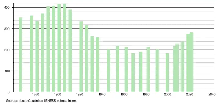 | L'évolution du nombre d'habitants est connue à travers les recensements de la population effectués dans la commune depuis 1866. Pour les communes de moins de 10 000 habitants, une enquête de recensement portant sur toute la population est réalisée tous les cinq ans, les populations légales des années intermédiaires étant quant à elles estimées par interpolation ou extrapolation[21]. Pour la commune, le premier recensement exhaustif entrant dans le cadre du nouveau dispositif a été réalisé en 2008[22]. En 2021, la commune comptait 282 habitants[Note 4], en augmentation de 13,71 % par rapport à 2015 (Hautes-Pyrénées : +1,04 %, France hors Mayotte : +1,84 %). |