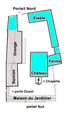 En 1815, pour reprendre la description du colonel Charras, « le domaine comprenait une vaste maison d’habitation, un logement de fermier, une chapelle et des bâtiments d’exploitation, rangés sur les quatre côtés d’un rectangle. Deux grandes portes y donnaient accès : l’une au sud, l’autre au nord. À l’est du château et y attenant se trouvait un grand jardin clos, du côté du nord, par une haie, et des autres côtés par des murs épais, hauts de plus de deux mètres. À l’est encore de ce jardin s’étendait un verger beaucoup plus grand… Un bois taillis, sous une futaie très claire, couvrait au sud, le verger, le jardin et le château, s’en approchant à une trentaine de mètres ». Ajoutons qu’à l’ouest, une petite porte s’ouvrait entre la remise et la maison du jardinier, donnant sur le potager.