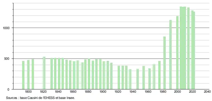 L'évolution du nombre d'habitants est connue à travers les recensements de la population effectués dans la commune depuis 1793. Pour les communes de moins de 10 000 habitants, une enquête de recensement portant sur toute la population est réalisée tous les cinq ans, les populations légales des années intermédiaires étant quant à elles estimées par interpolation ou extrapolation[32]. Pour la commune, le premier recensement exhaustif entrant dans le cadre du nouveau dispositif a été réalisé en 2004[33].