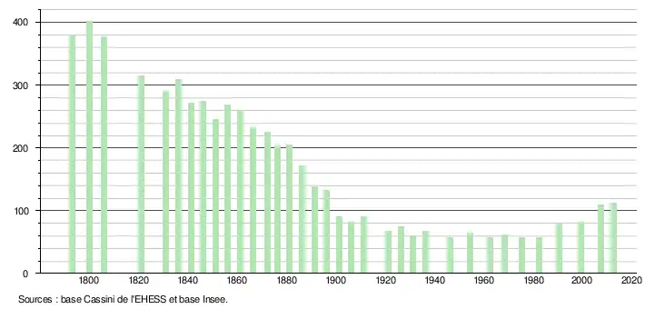 - Par convention dans Wikipédia, le principe a été retenu de n’afficher dans le tableau des recensements et le graphique, pour les populations légales postérieures à 1999, que les populations correspondant à une enquête exhaustive de recensement pour les communes de moins de 10 000 habitants, et que les populations des années 2006, 2011, 2016, etc. pour les communes de plus de 10 000 habitants, ainsi que la dernière population légale publiée par l’Insee pour l'ensemble des communes.