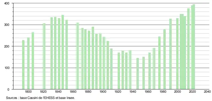 L'évolution du nombre d'habitants est connue à travers les recensements de la population effectués dans la commune depuis 1793. Pour les communes de moins de 10 000 habitants, une enquête de recensement portant sur toute la population est réalisée tous les cinq ans, les populations légales des années intermédiaires étant quant à elles estimées par interpolation ou extrapolation[17]. Pour la commune, le premier recensement exhaustif entrant dans le cadre du nouveau dispositif a été réalisé en 2004[18].