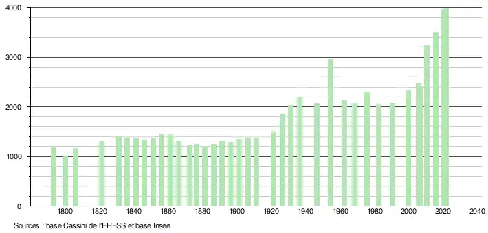 | L'évolution du nombre d'habitants est connue à travers les recensements de la population effectués dans la commune depuis 1793. Pour les communes de moins de 10 000 habitants, une enquête de recensement portant sur toute la population est réalisée tous les cinq ans, les populations légales des années intermédiaires étant quant à elles estimées par interpolation ou extrapolation[61]. Pour la commune, le premier recensement exhaustif entrant dans le cadre du nouveau dispositif a été réalisé en 2005[62]. En 2021, la commune comptait 3 983 habitants[Note 6], en augmentation de 14,13 % par rapport à 2015 (Gironde : +6,88 %, France hors Mayotte : +1,84 %). |
