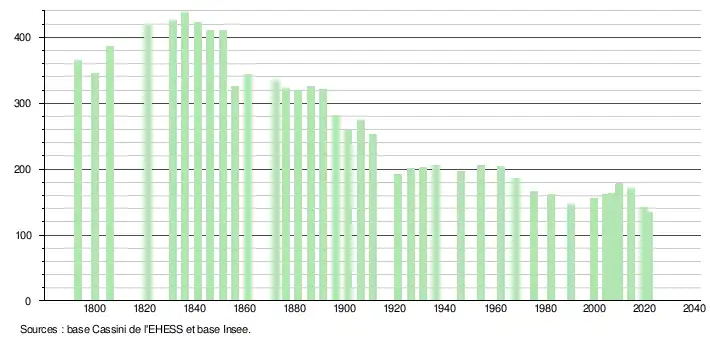 L'évolution du nombre d'habitants est connue à travers les recensements de la population effectués dans la commune depuis 1793. Pour les communes de moins de 10 000 habitants, une enquête de recensement portant sur toute la population est réalisée tous les cinq ans, les populations légales des années intermédiaires étant quant à elles estimées par interpolation ou extrapolation[18]. Pour la commune, le premier recensement exhaustif entrant dans le cadre du nouveau dispositif a été réalisé en 2004[19].