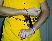 Prisonnier menotté avec une housse de menottes de type CTS Thompson Black Box, fixée avec une chaîne ventrale autour de sa taille.